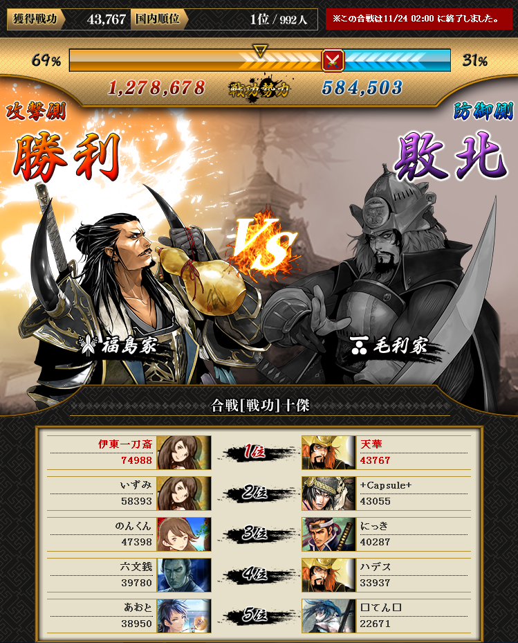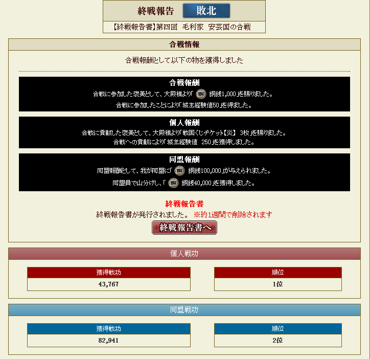 まぁ前回動けなかった鬱憤を晴らすように戦功TOPでしたw