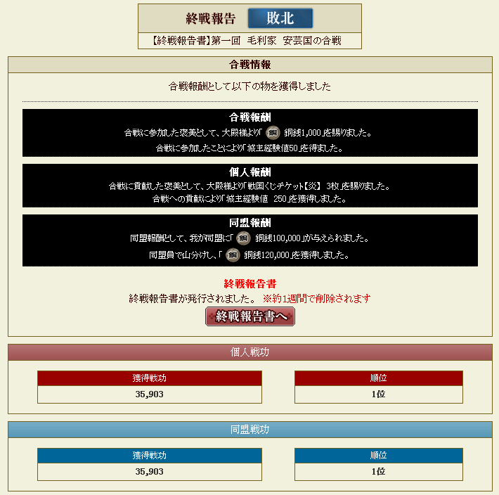 負けではありますが同盟1~3位以内に入っていましたので