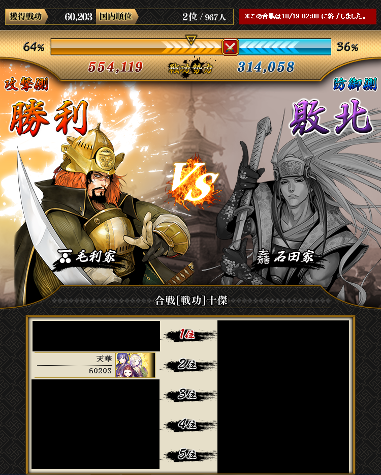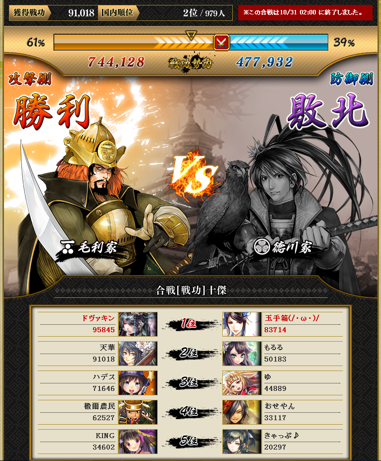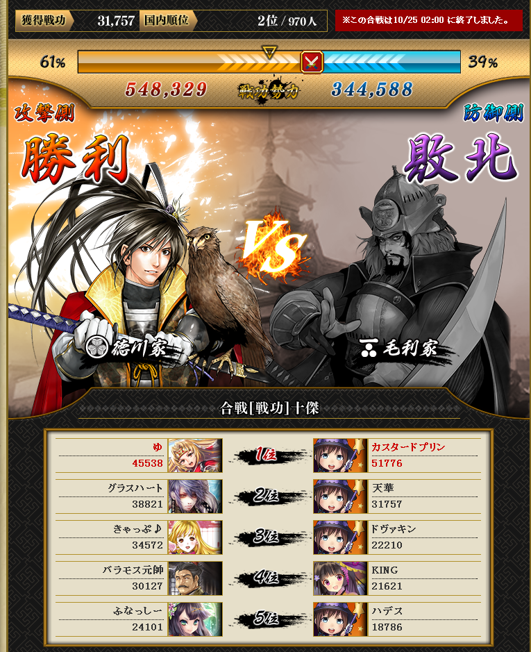まぁ個人は戦功3位に入れたので満足です